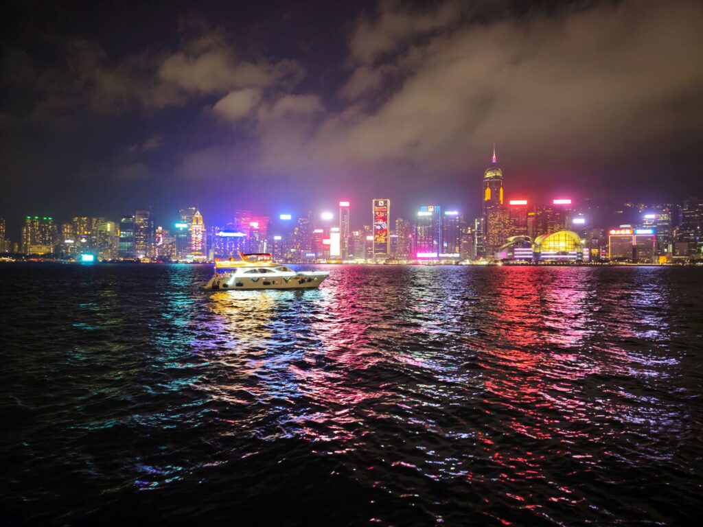 The show runs approximately 15 minutes and involves buildings on both sides of the harbor — the Hong Kong Island towers providing the primary visual display while searchlights sweep across the sky and lasers reach across the water. The coordination between buildings, the scale of the visual field, and the experience of watching it surrounded by hundreds of other people all facing the same direction creates a specific collective atmosphere.