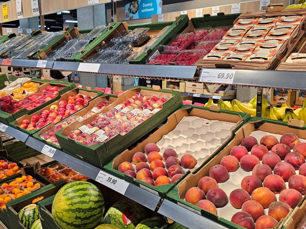 As I explored the aisles, I found myself drawn to products I wouldn’t normally see back home. The dairy section featured various types of creamy yogurts, quark desserts, and locally produced cheeses. I picked up a wedge of Hermelín, a soft cheese similar to Camembert, and a cup of creamy cherry yogurt—both delicious.