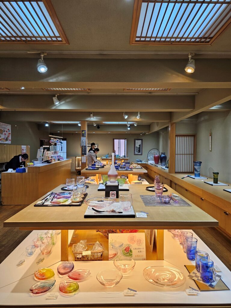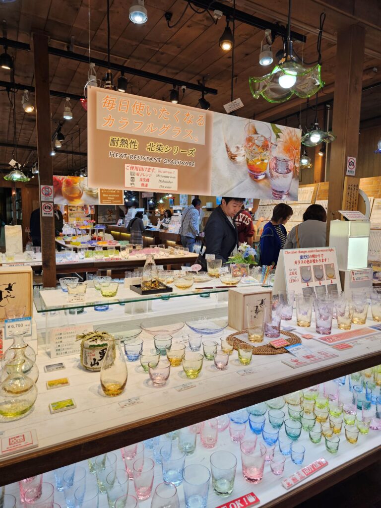 During winter, the warm yellow glow of the lamps contrasts beautifully with the snow outside, giving the outlet a cozy, dreamlike feel. In summer, sunlight filters through the windows, making the glassware shimmer like jewels. It’s no exaggeration to say that the shop itself is a work of art.