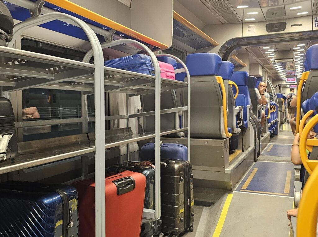 Boarding the Leonardo Express feels more like stepping into a modern, high-speed train than a typical commuter line. Each car is equipped with air conditioning and bright lighting, offering a pleasant atmosphere. There is plenty of seating, and you’ll find dedicated luggage racks at the ends of each car, designed specifically for travelers with suitcases. Smaller carry-on bags can be placed in the overhead compartments above the seats.