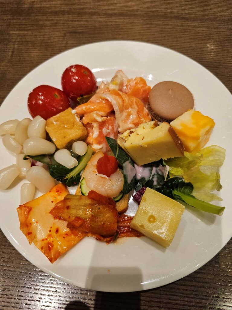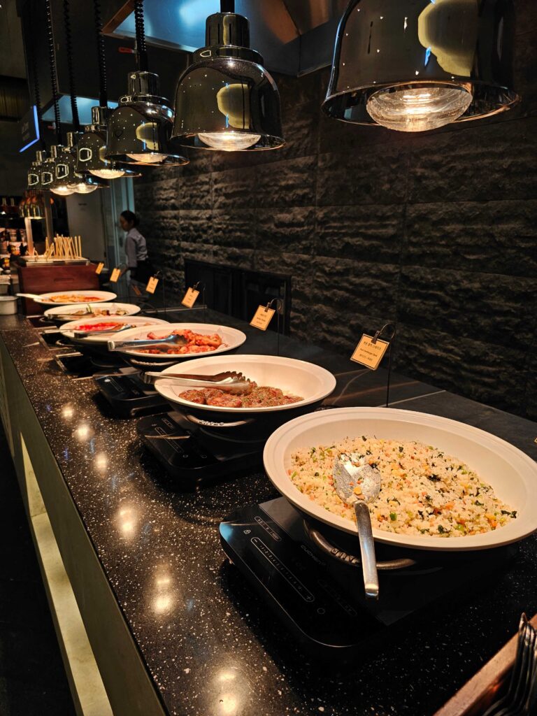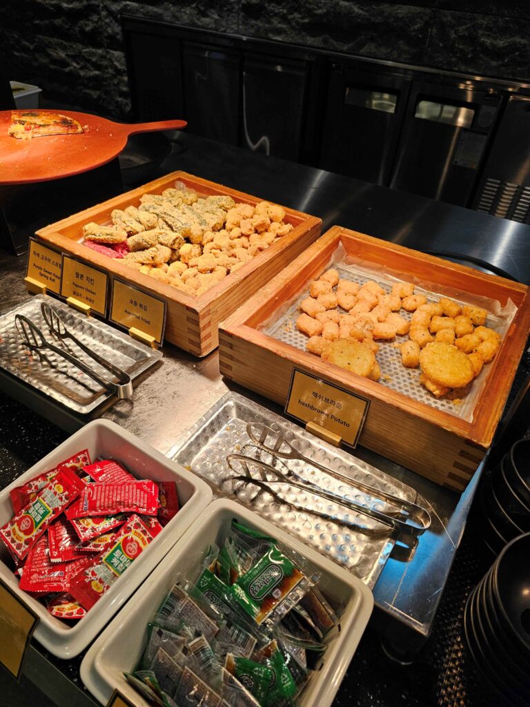 During my visit, I was pleasantly surprised by the diversity of hot dishes available. There were Korean favorites like bulgogi, kimchi fried rice, and tteokbokki, as well as international selections including Japanese curry, XO fried rice, chopped steak, and creamy pasta with mushrooms. A salad bar offered fresh greens, cheese platters, and fruit trays, while the dessert station had cakes and traditional Korean snacks.