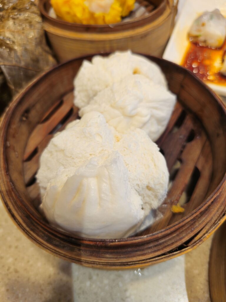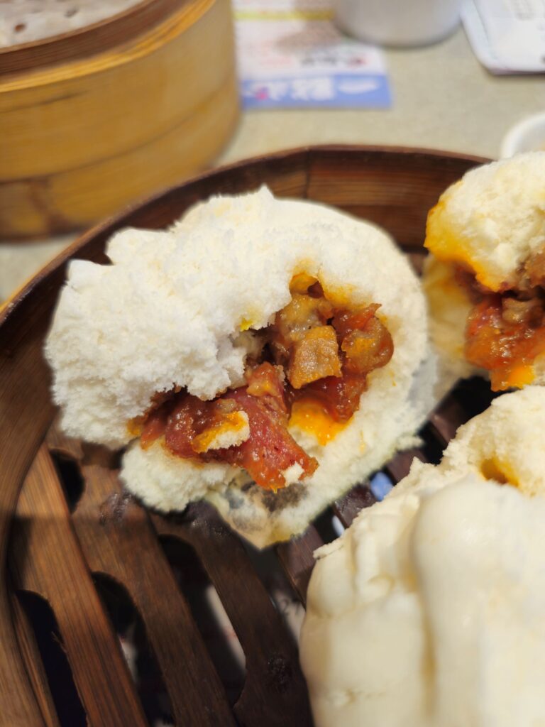 Available in both steamed (fluffy white bun) and baked (glazed, slightly sweet exterior) versions. The steamed version at One Dim Sum is the more traditional and well-executed: the bun is soft and fluffy, the char siu filling is properly seasoned and not overly sweet. The baked version has a caramelized exterior that provides a different textural experience.