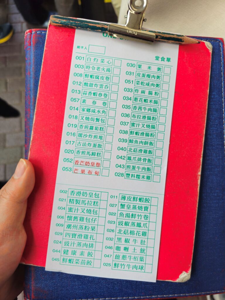The order form lists all available dishes in Chinese and English — useful for visitors who want specific dishes and don’t want to rely on what happens to come past on the trolley.