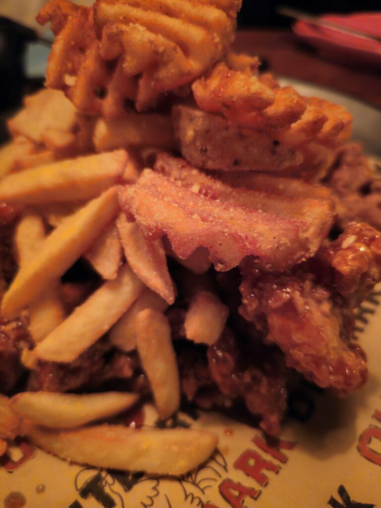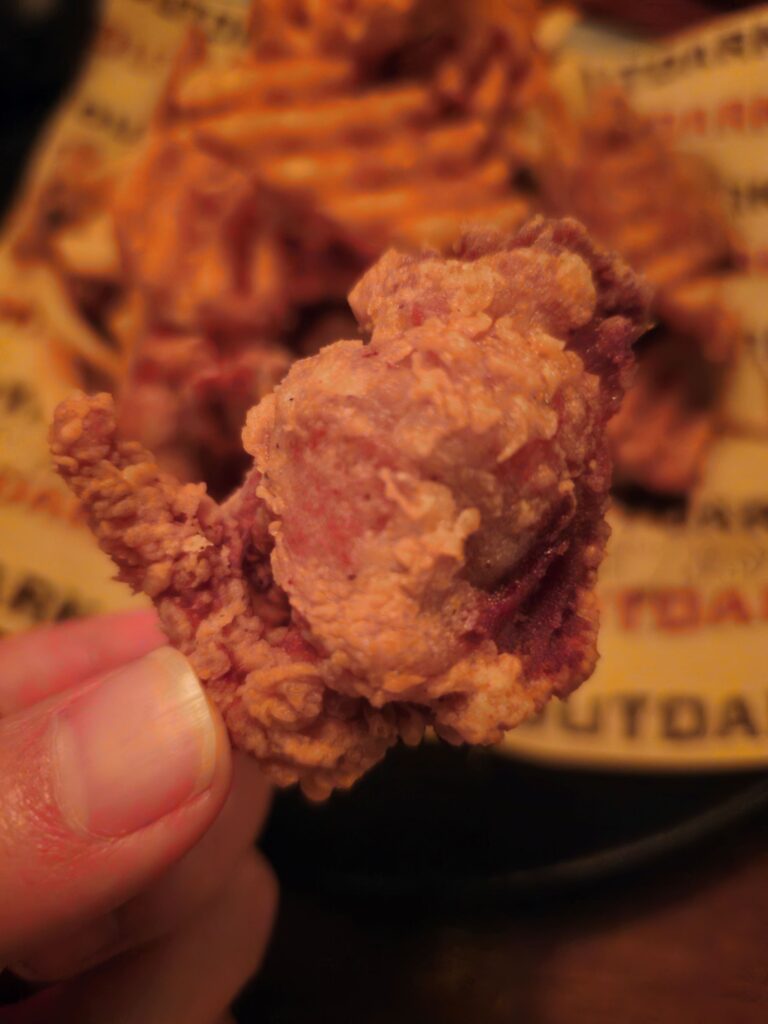 Eating yangnyeom chicken requires accepting that the sauce will soften the crust slightly — an unavoidable trade-off that the best yangnyeom chicken manages by applying the sauce immediately before serving rather than letting it sit. Outdark’s version handles this timing correctly; the crunch, while reduced by the sauce, is still present in the first few bites.
