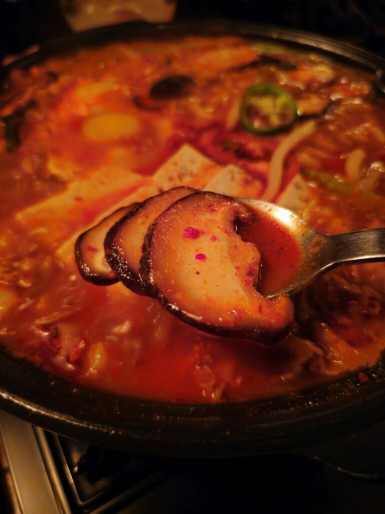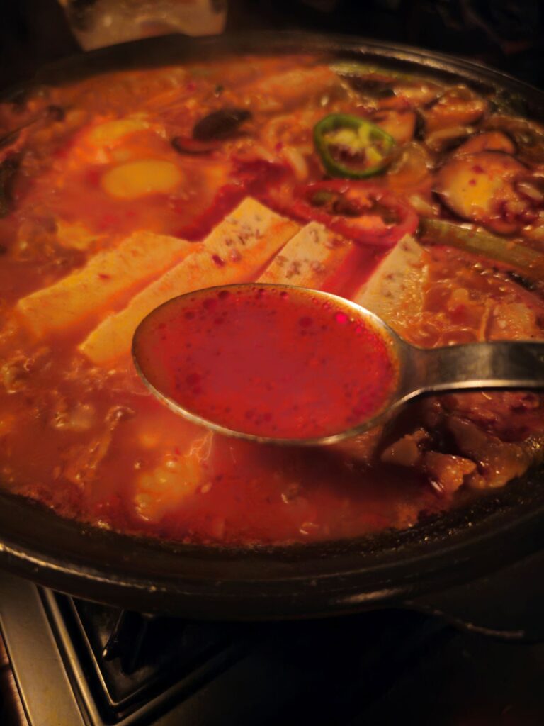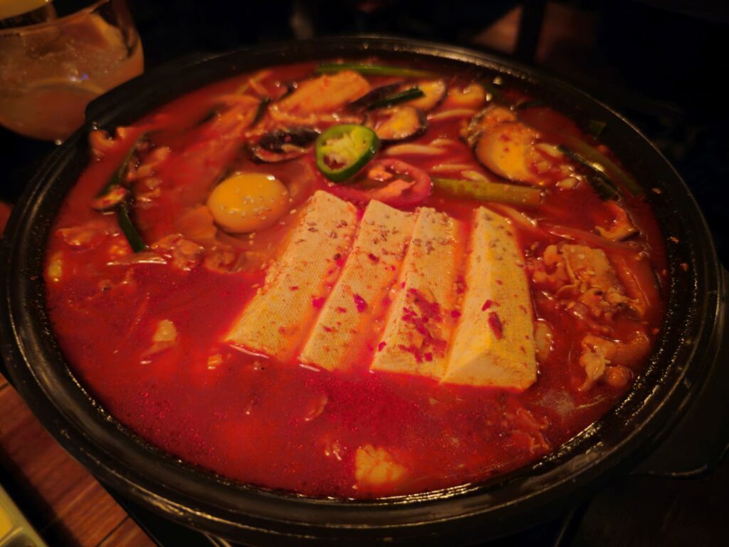 Spice level: The dish as served is moderately spicy — present heat without overwhelming the other flavors. For visitors who want more heat, asking for additional gochugaru is worth requesting; for those who want less, the tofu and udon together temper the spice significantly.
