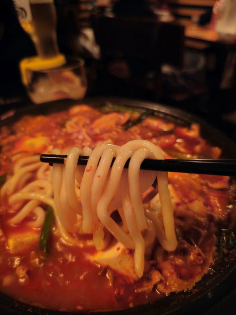 The broth has the characteristic Korean fermented depth — the gochujang providing heat and sweetness, the doenjang providing the savory funk that distinguishes Korean broth from other Asian spiced soups. The udon absorbs this broth differently from thin Korean noodles; the thickness means more broth clings to each noodle, making each bite more intensely flavored than a thinner noodle would be.