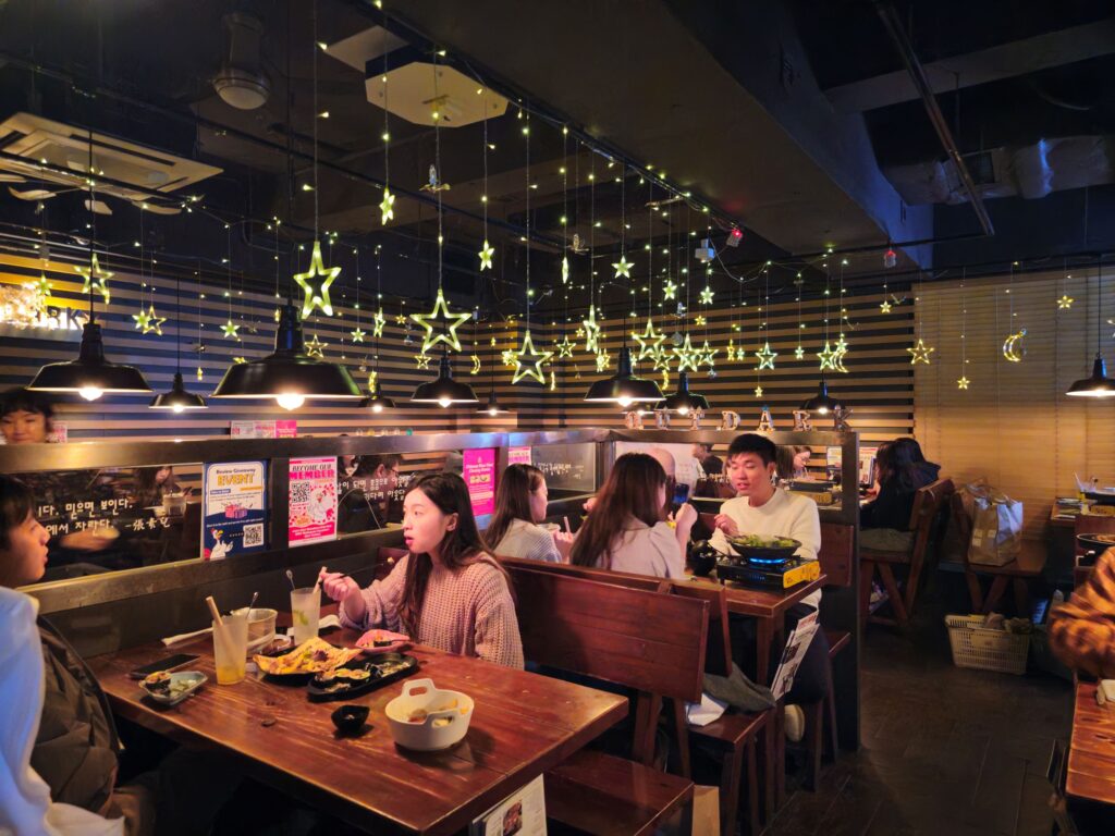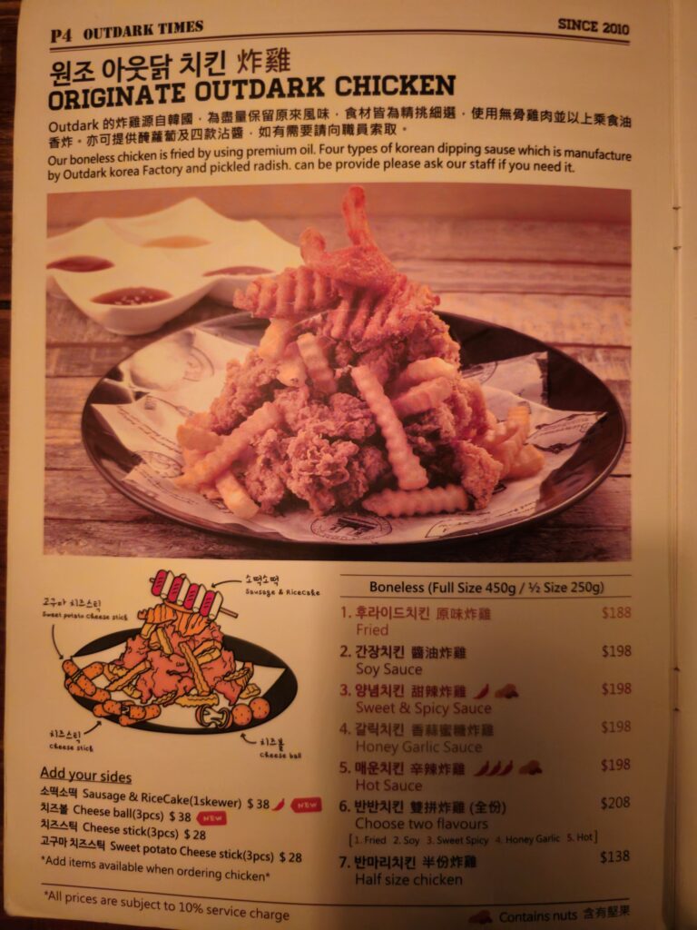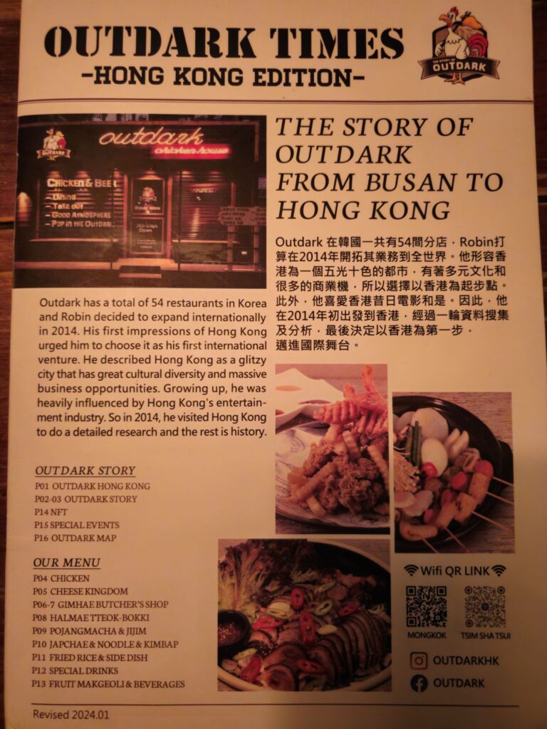The Tsim Sha Tsui Outdark occupies a mid-range restaurant space — comfortable seating for groups and couples, a menu that’s available in Korean, Chinese, and English, and an atmosphere that’s lively without being overwhelming. It’s designed for a relaxed dinner rather than a quick meal, which reflects the Korean pub-restaurant format that the chicken-and-beer chimaek culture produces.