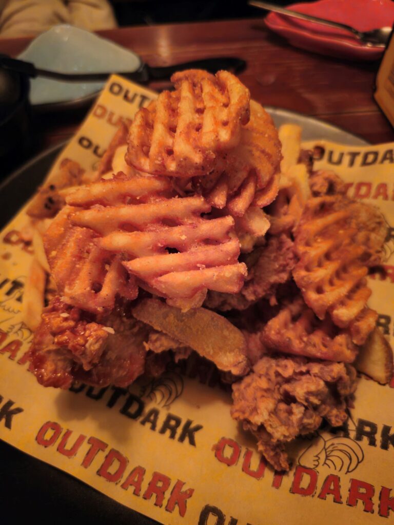Yangnyeom (양념): The sweet and spicy sauced version — the version most associated with Korean fried chicken internationally. Outdark’s yangnyeom sauce coats the fried chicken in a lacquered glaze that is simultaneously sticky, sweet, spicy, and deeply savory. The sauce ratio is calibrated correctly: enough to coat every surface of the chicken without pooling at the bottom of the serving dish or overwhelming the crisp exterior it’s applied to.
