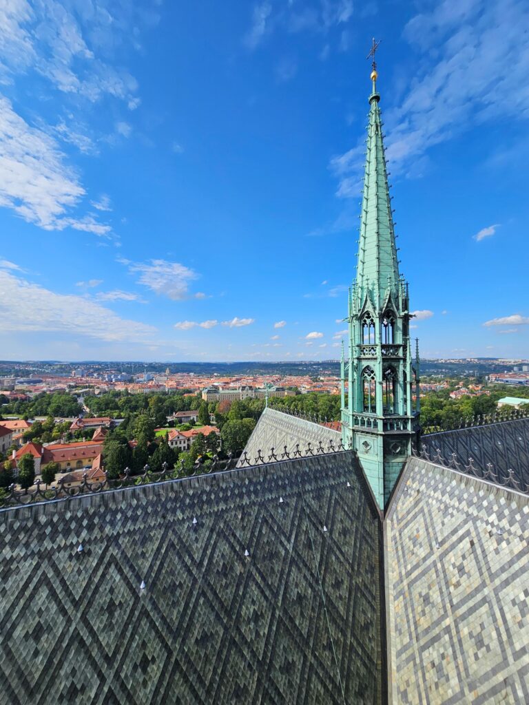 One of the highlights of visiting St. Vitus Cathedral is ascending to the Great South Tower, which leads to a panoramic rooftop viewpoint. Be prepared for a workout: the spiral staircase consists of 287 narrow steps, winding tightly upward with limited passing space. It’s not an easy climb, but the reward at the top is absolutely worth it.