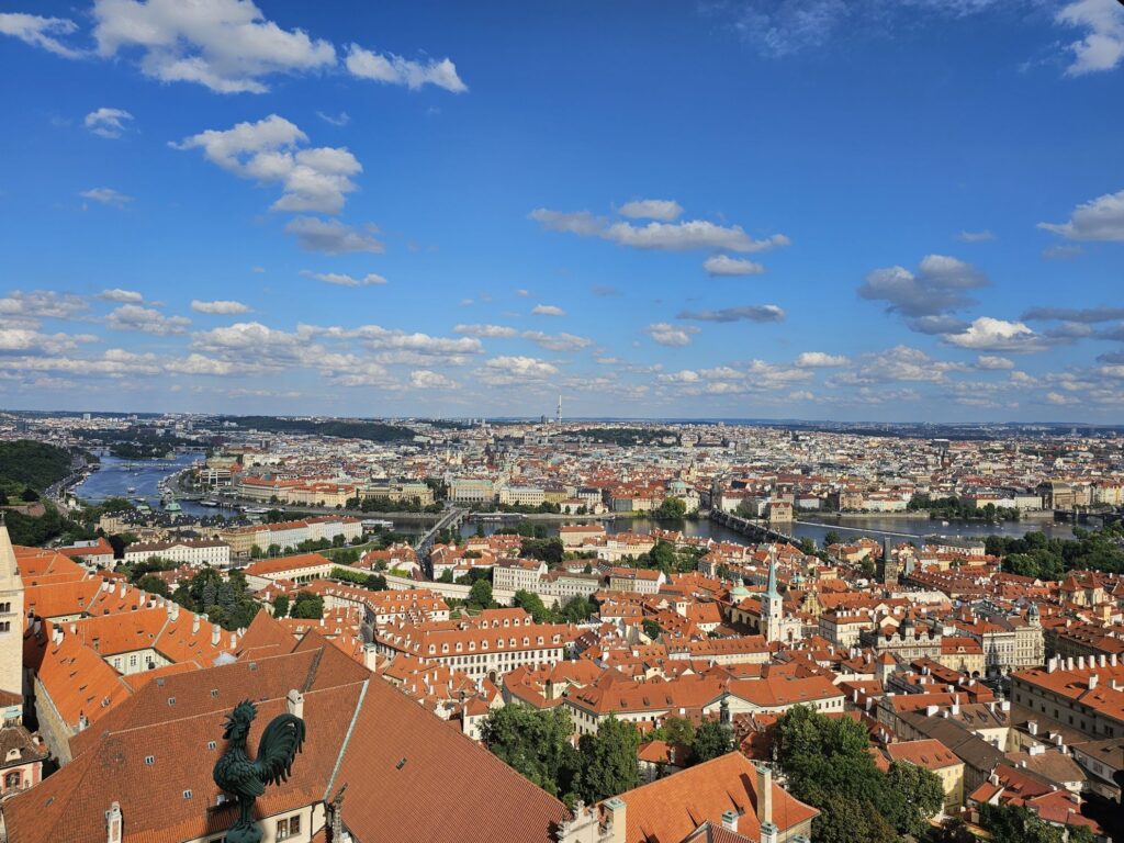 From the tower, you’re treated to one of the best views in Prague. The red-tiled roofs of the Old Town stretch into the distance, the Vltava River winds gracefully below, and the Charles Bridge connects the historic quarters like a stone ribbon. On clear days, you can see all the way to the rolling hills beyond the city.
