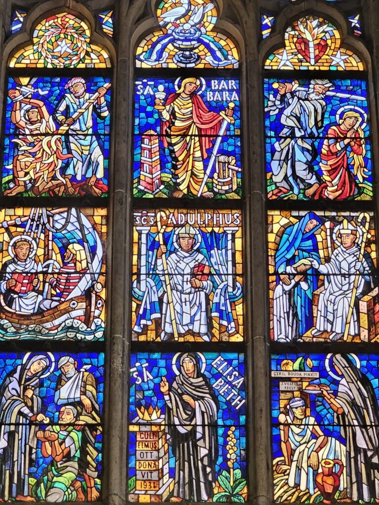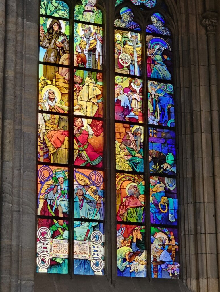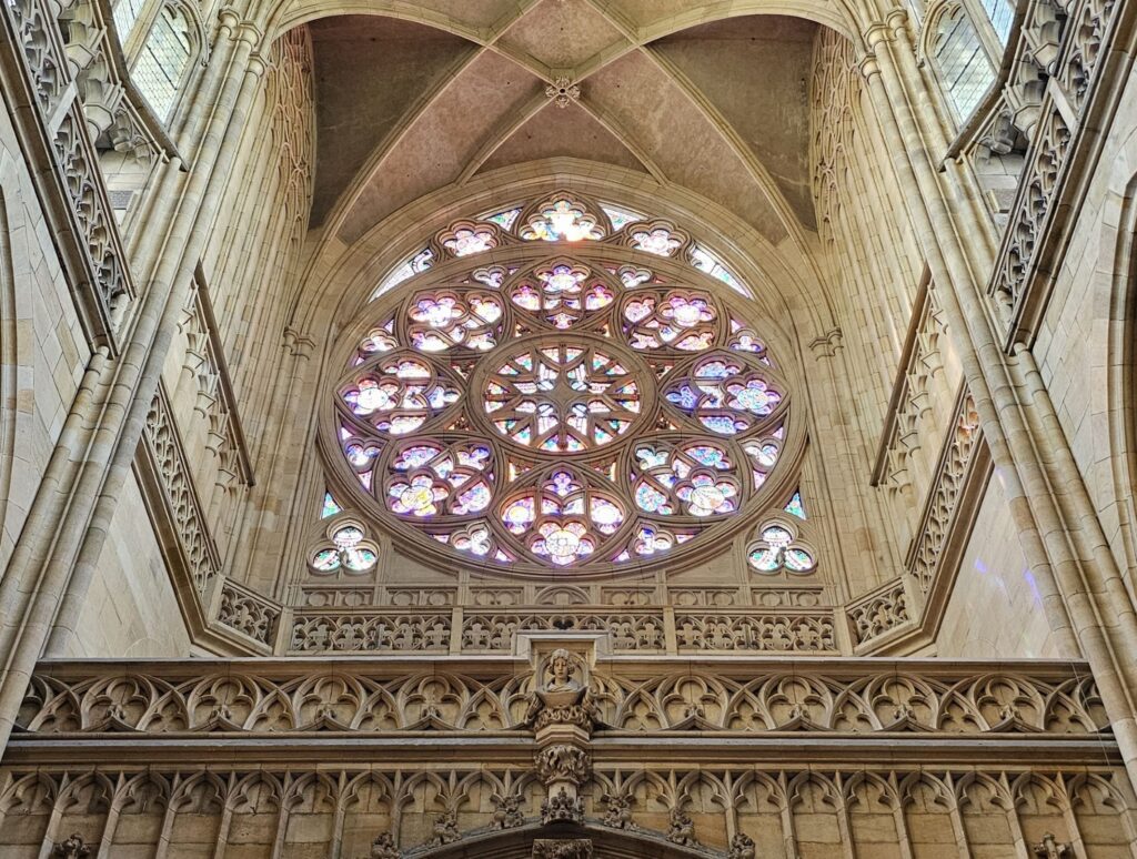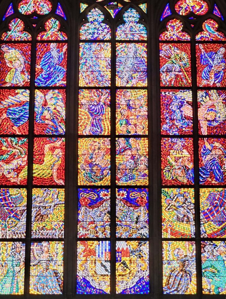 From the outside, the cathedral’s soaring spires and intricate stone carvings dominate the castle skyline. Stained glass windows glow brilliantly in the sunlight, particularly the famous window designed by Czech artist Alfons Mucha. Inside, the space is vast and awe-inspiring, with high ribbed vaults, massive pillars, and delicate rose windows that flood the interior with colored light.