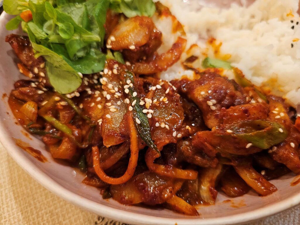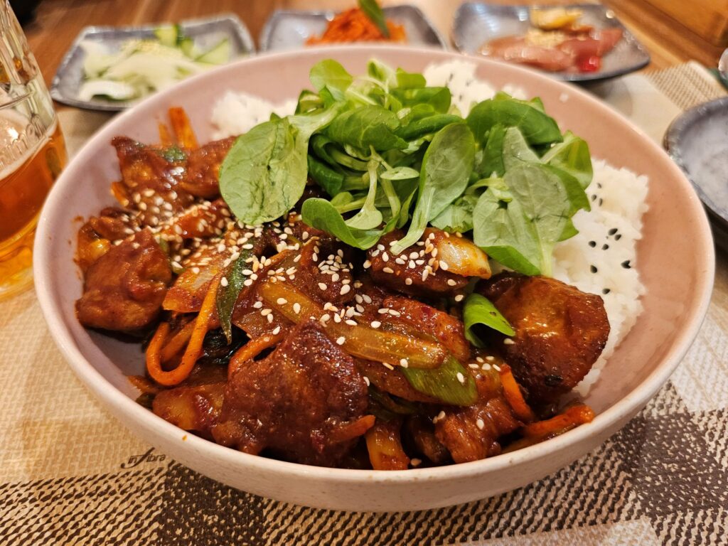 On my recent visit to Praha MATZIP, I ordered the Jeyuk Deopbap (Spicy Pork Rice Bowl), a staple comfort food in Korea. The dish was served piping hot, with tender slices of pork marinated in a rich, gochujang-based sauce that balanced sweetness, spice, and umami in every bite. The pork was generously portioned and laid over a bed of perfectly steamed white rice, accompanied by sautéed vegetables and a side of kimchi. It wasn’t just satisfying—it was transporting. For a brief moment, I could have been dining in a bustling eatery in Seoul.