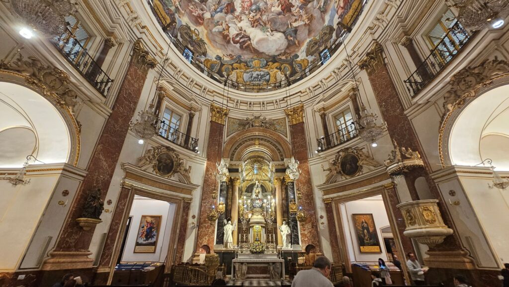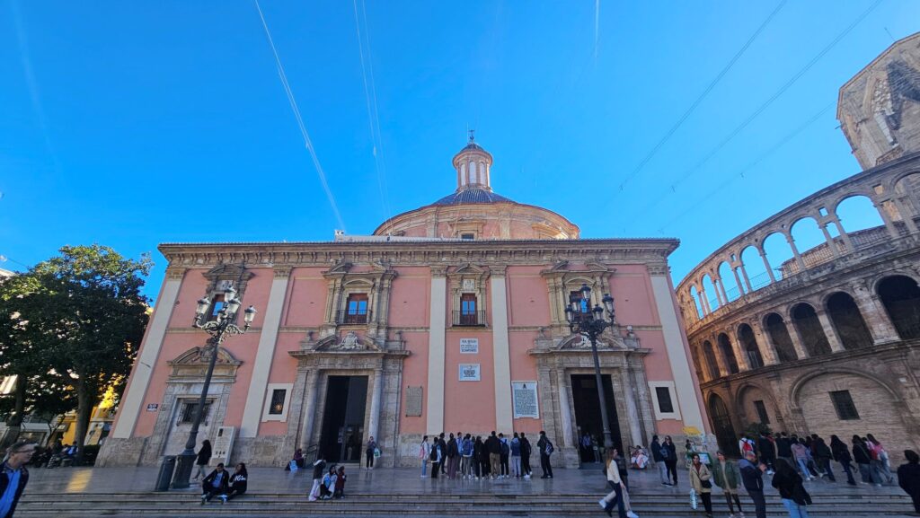 Outside, the basilica’s blue-tiled dome stands out against the skyline, glimmering in the Mediterranean sun. Its placement is not accidental: the building sits slightly askew to face the Valencia Cathedral, a symbolic gesture that connects the two holiest spaces in the city.