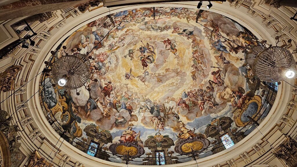 Every corner of the basilica tells a story. The frescoes on the dome create a sense of endless movement, angels appearing to hover between heaven and earth. The side chapels display intricate carvings and devotional art from the 17th and 18th centuries, offering moments of quiet contemplation.