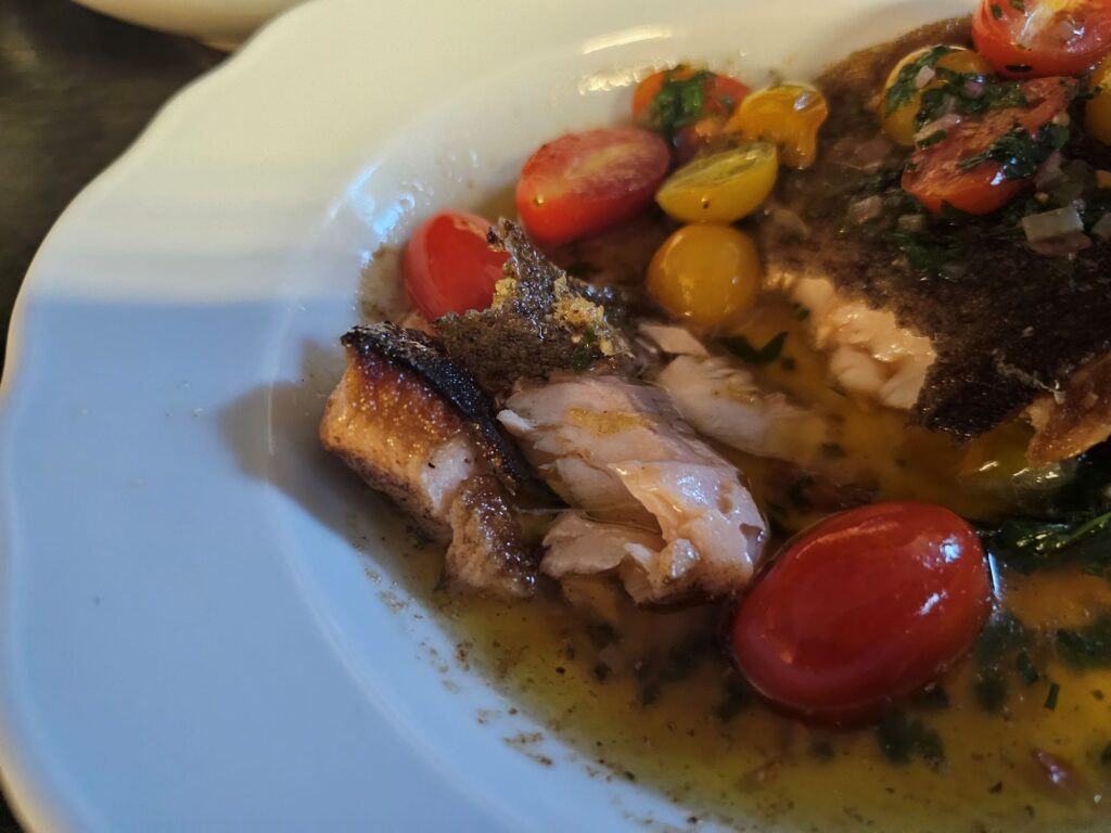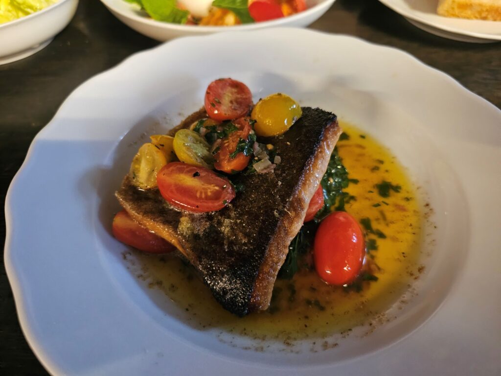 Next came the grilled trout, a dish that showcased the kitchen’s confidence. The fish arrived perfectly cooked — skin crisp and golden, flesh tender and slightly buttery. It was served with roasted vegetables and a lemon-herb butter sauce that enhanced the natural flavor of the fish without overpowering it.