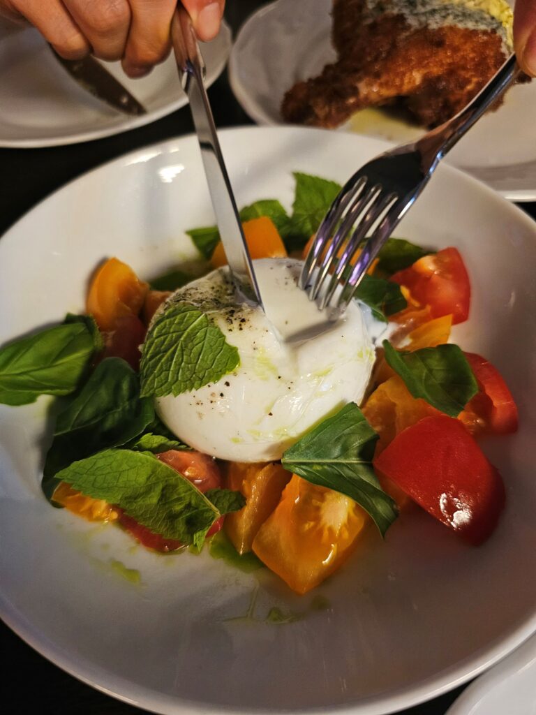 Each bite brought a play of contrasts: the smooth burrata melting against the crunch of bread, the sweet acidity of tomatoes cutting through the richness, and the fragrant basil tying it all together. It wasn’t a complicated dish, but it was executed with precision and respect for ingredients.