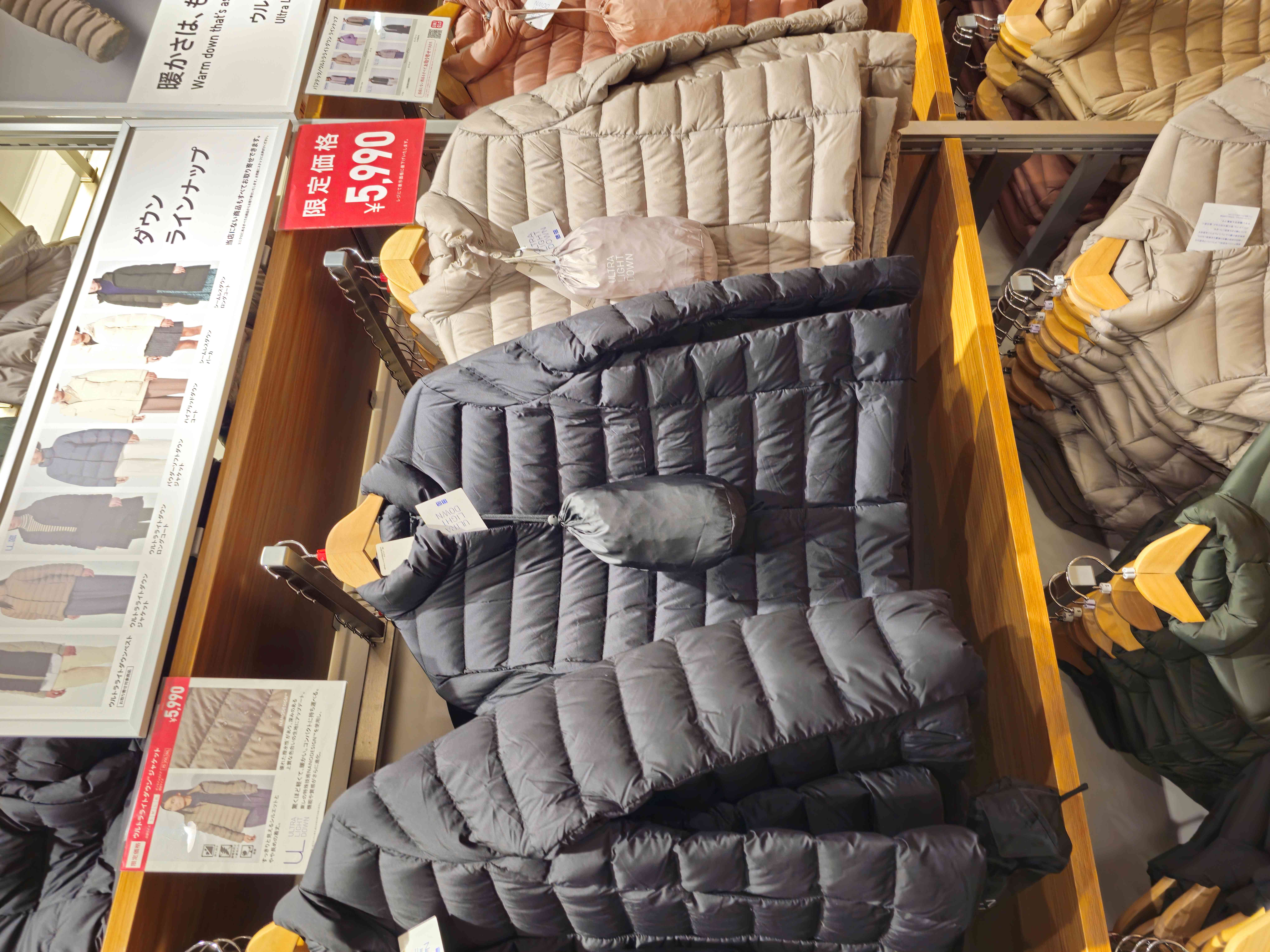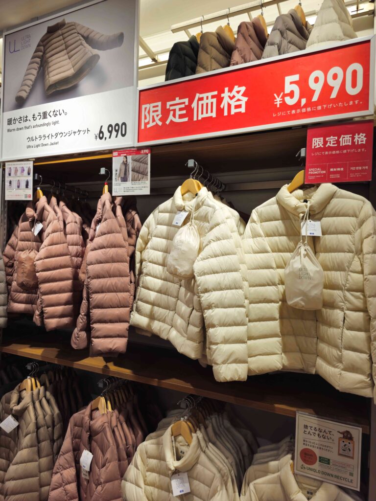 - Down Jackets: Lightweight compact models start around ¥5,990; premium Ultra Light Down coats range up to ¥9,990