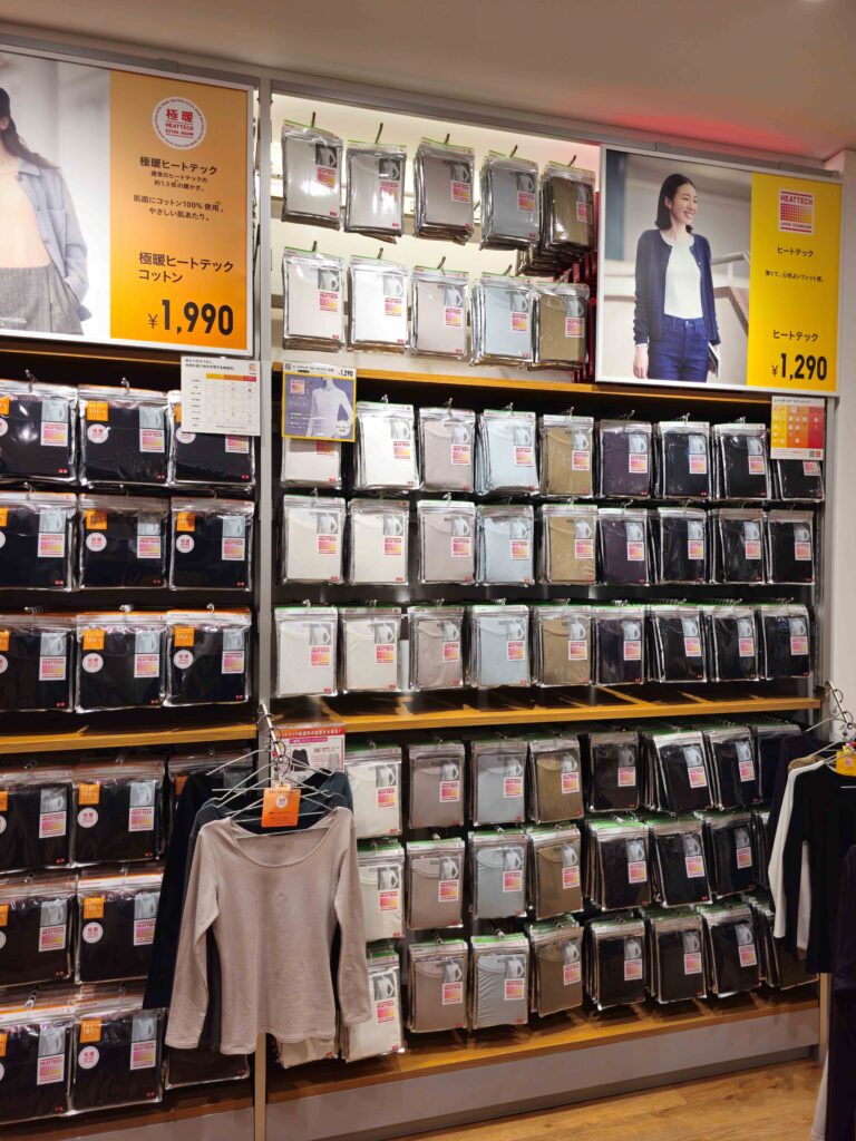 - HeatTech Innerwear: Classic HeatTech tops and leggings from ¥990; HeatTech Extra Warm from ¥1,500–¥1,990; Ultra Warm series from ¥2,990